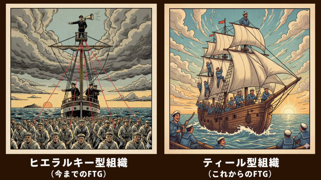 従来型の「ヒエラルキー型組織」は、船長から船員まで階級が細かく決められ、厳しい上下関係や命令系統のもとで動くイメージです。