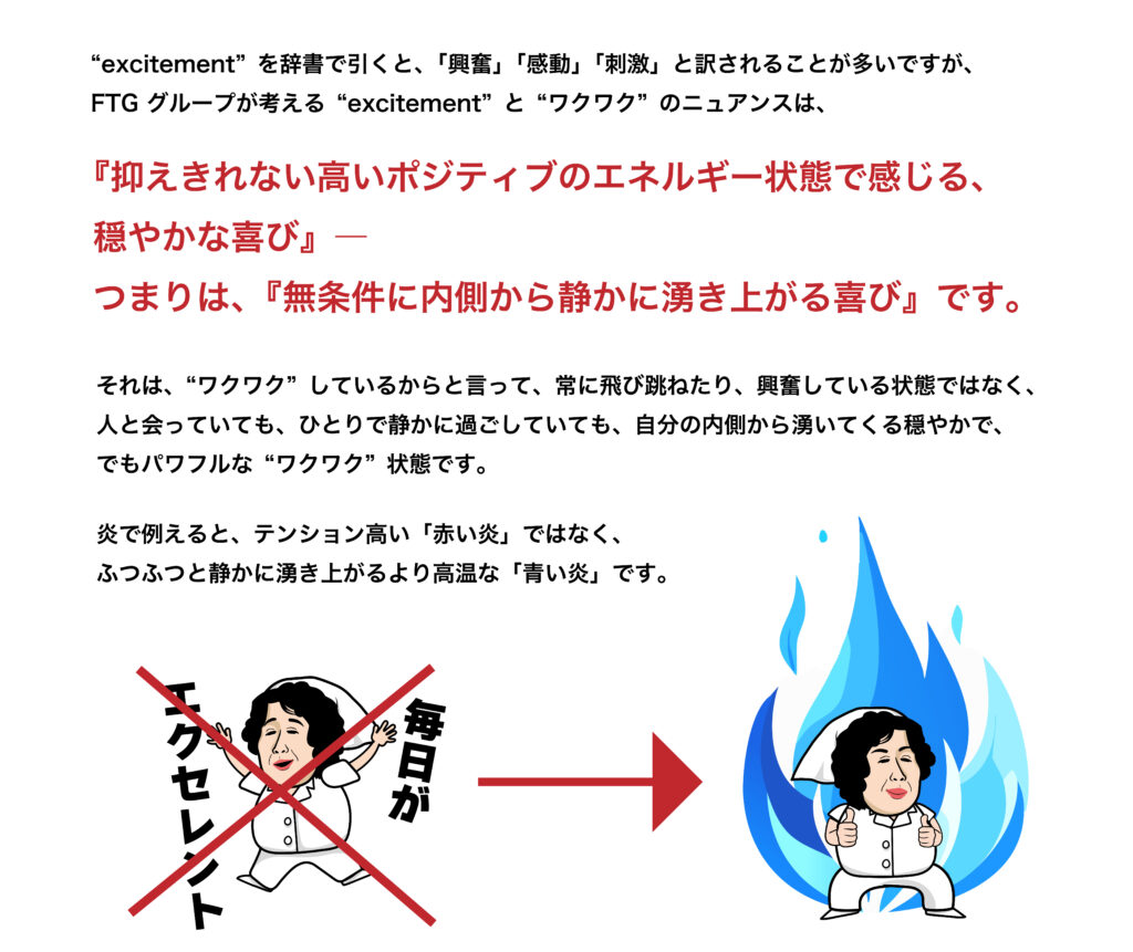 FTG グループの“ワクワク”の元になった英語は、“excitement”です。