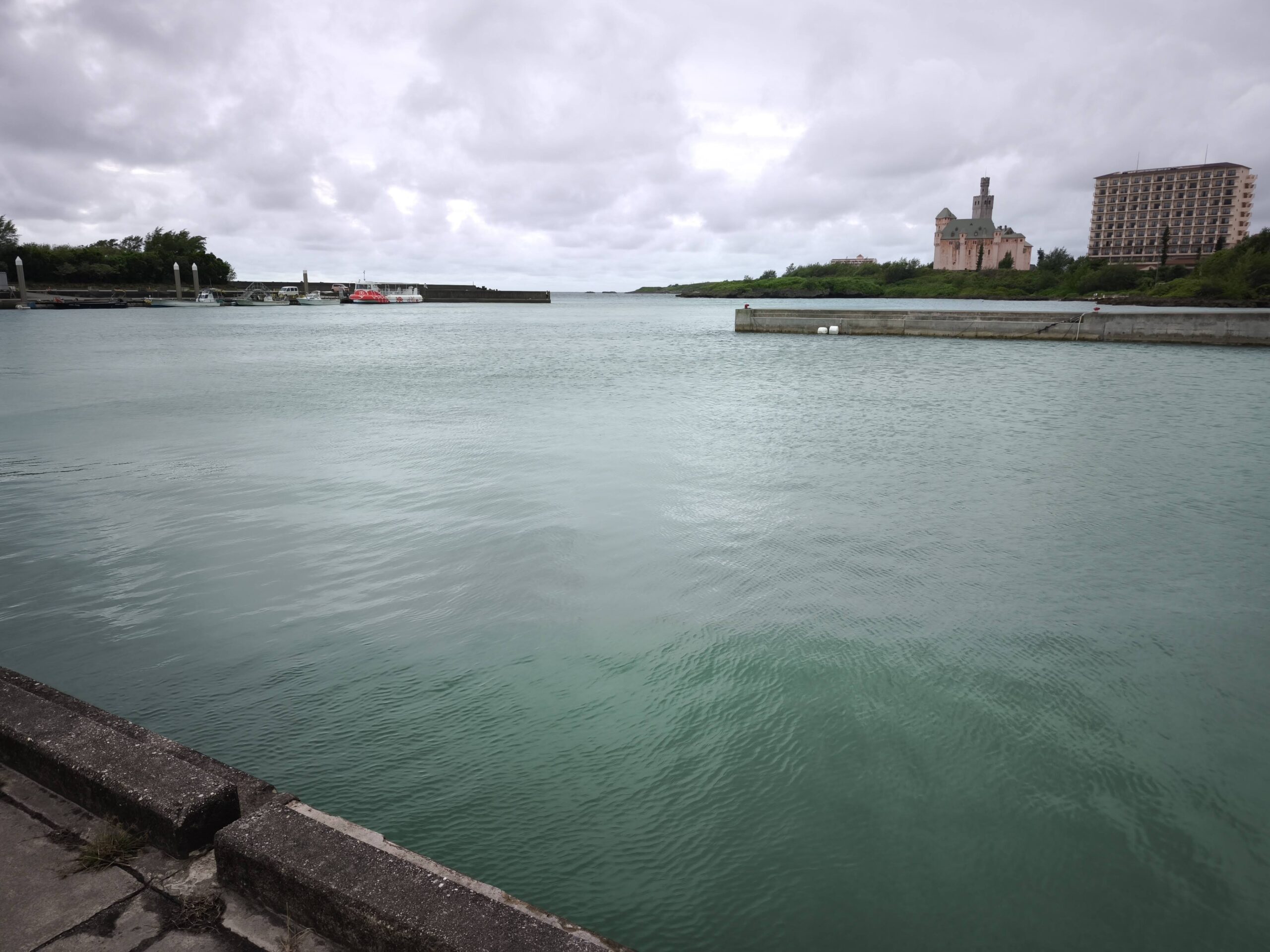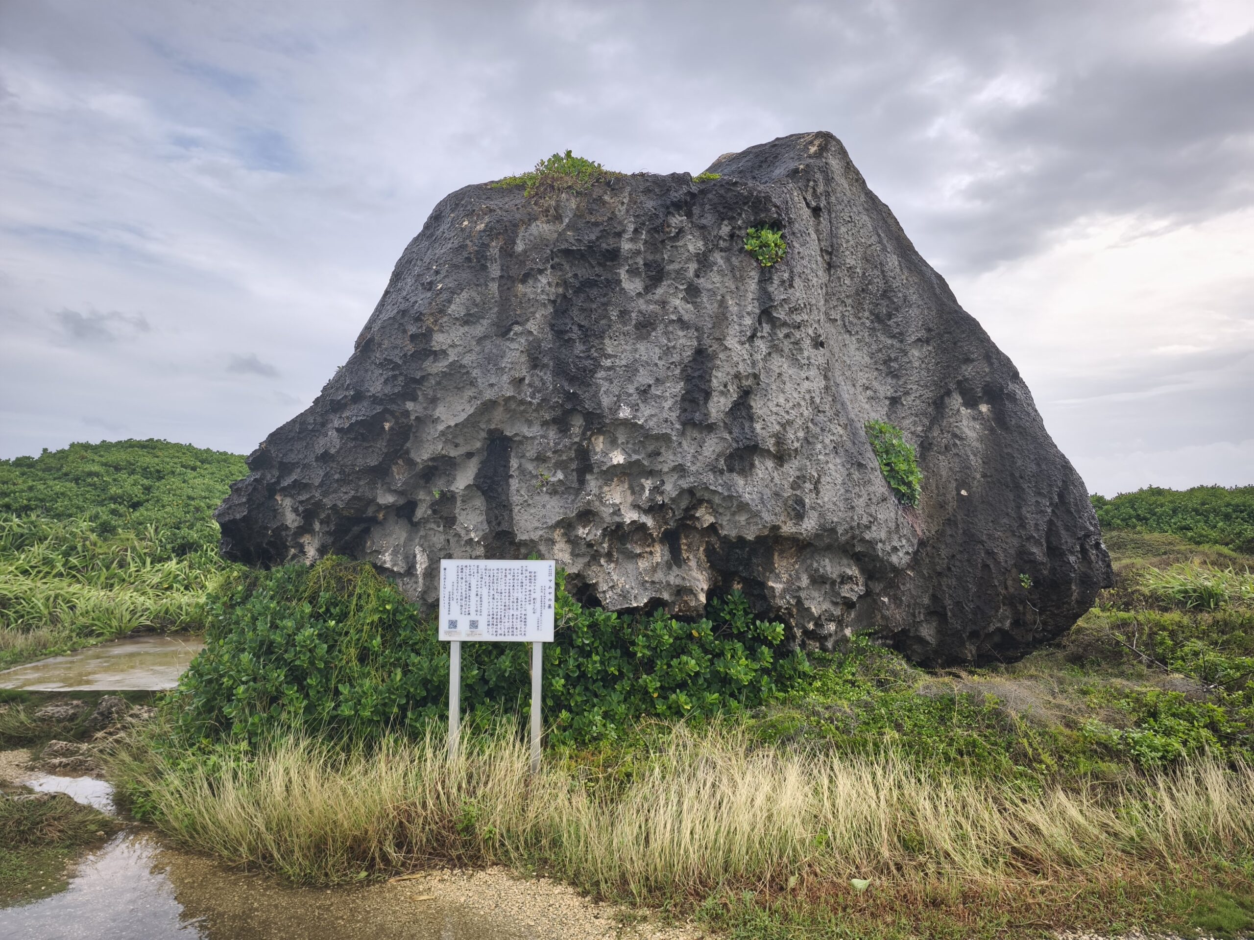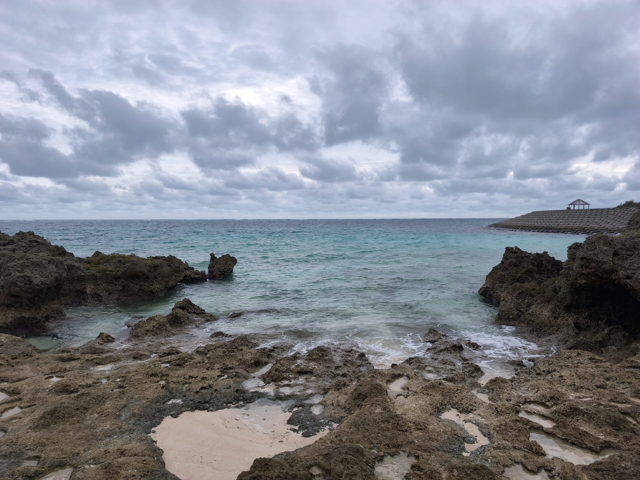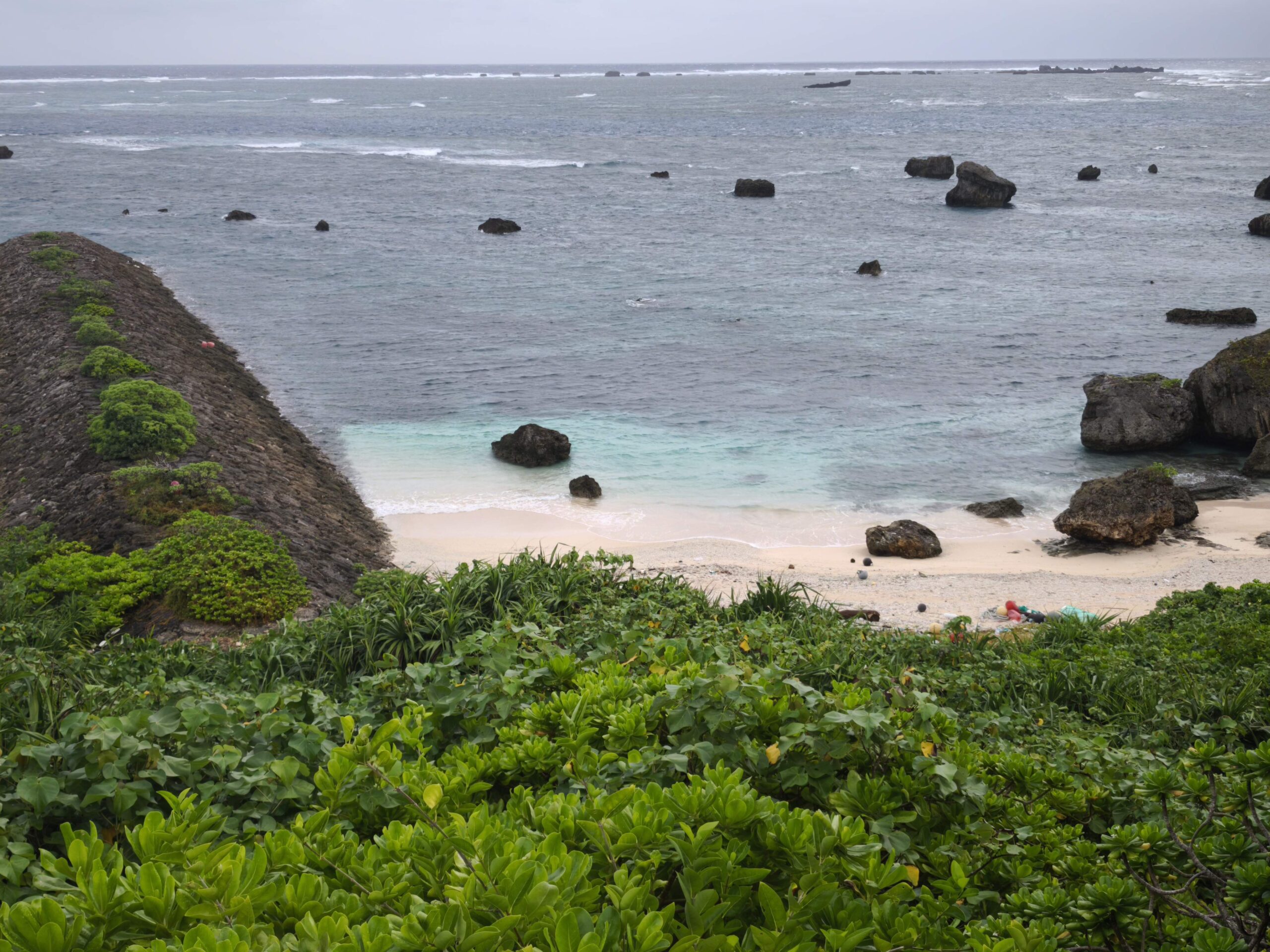 2⽇⽬はレンタカーで島内を巡ります。空は今にも泣き出しそうな表情を⾒せながらも、不思議と⽬的地に着くたび、⾬がすっと⽌んでくれます。最初に訪れた「渡⼝の浜」では、真っ⽩な砂浜と、エメラルドグリーンに輝く「伊良部ブルー」に圧倒!⾬上がりでも吸い込まれそうなほど透明で、⾔葉を失うほどの美しさです。